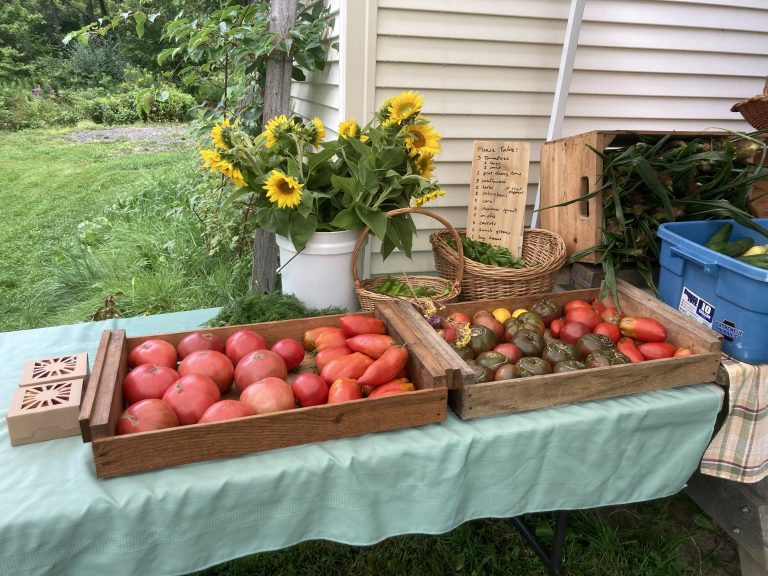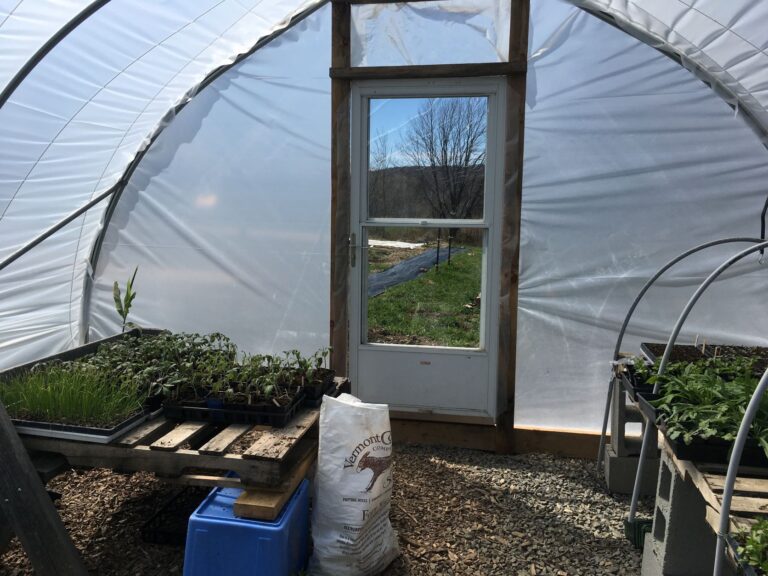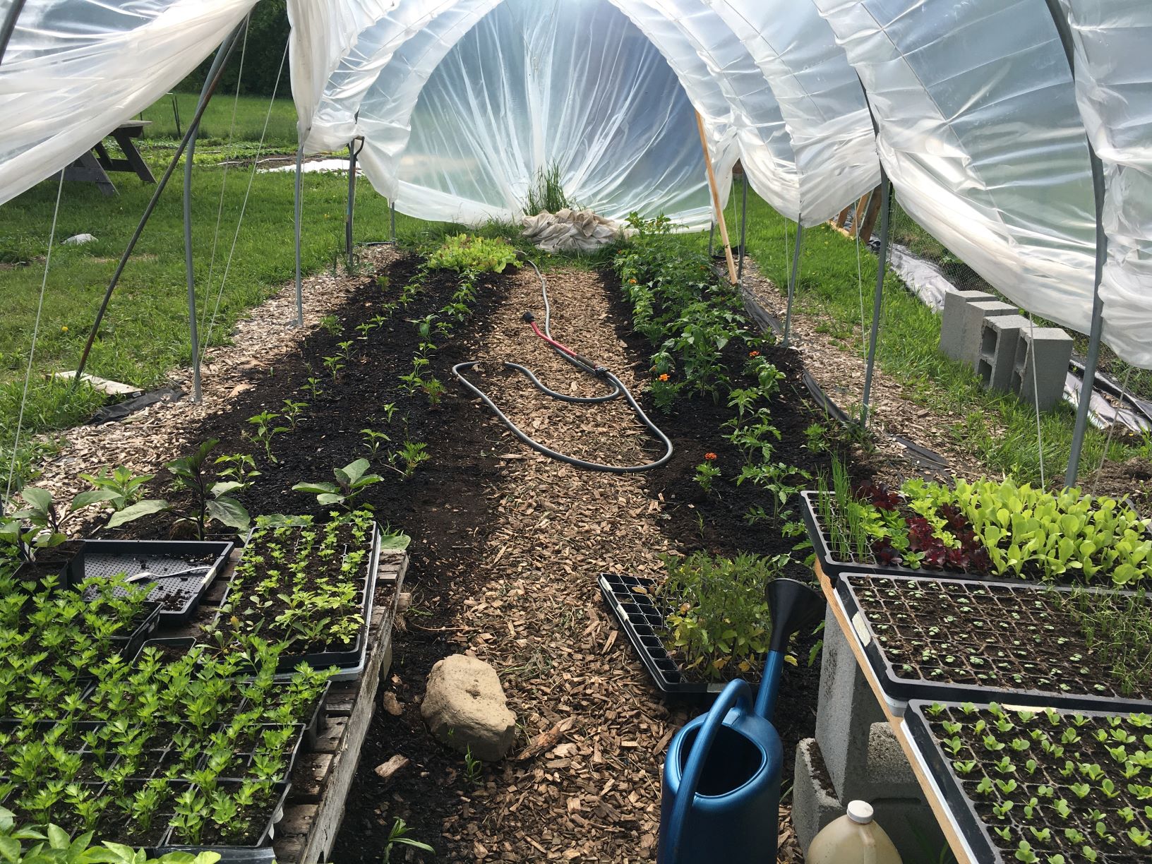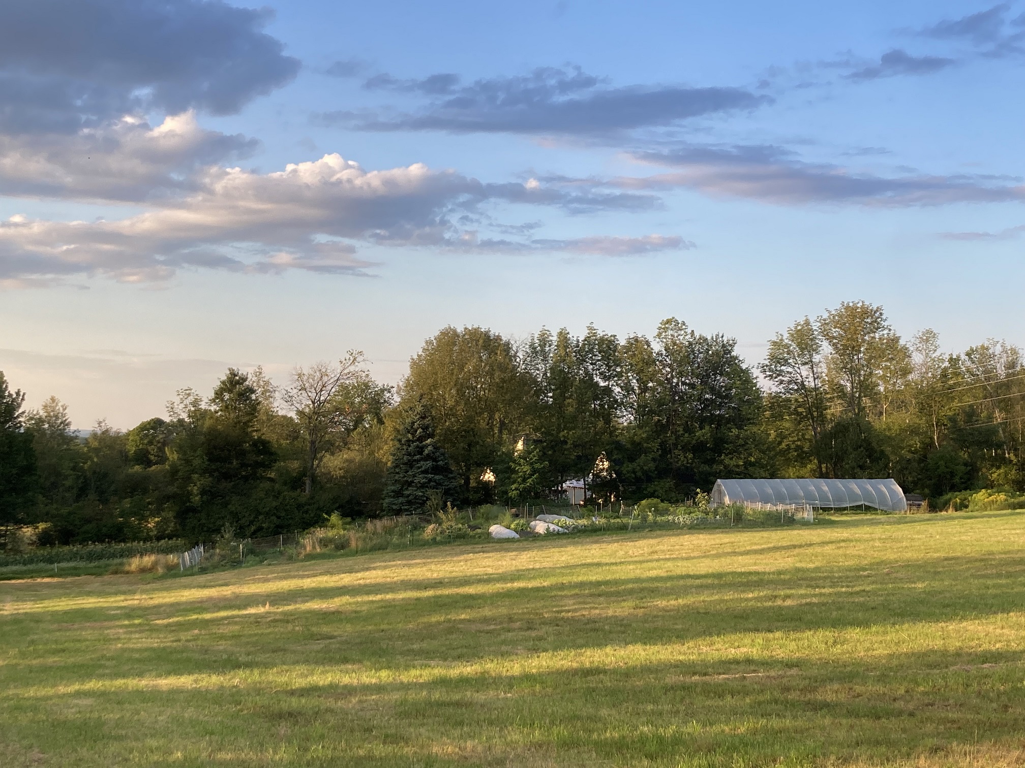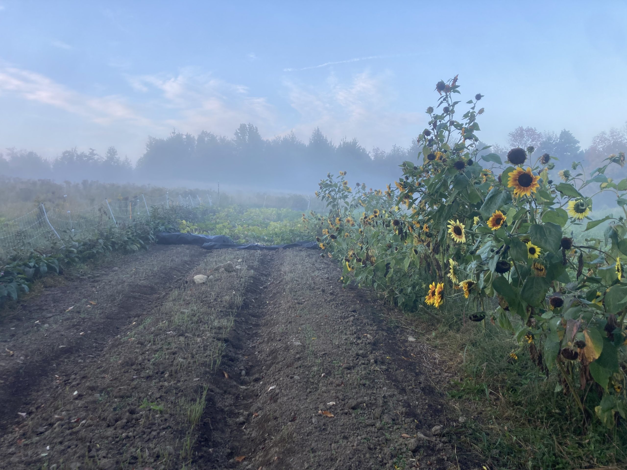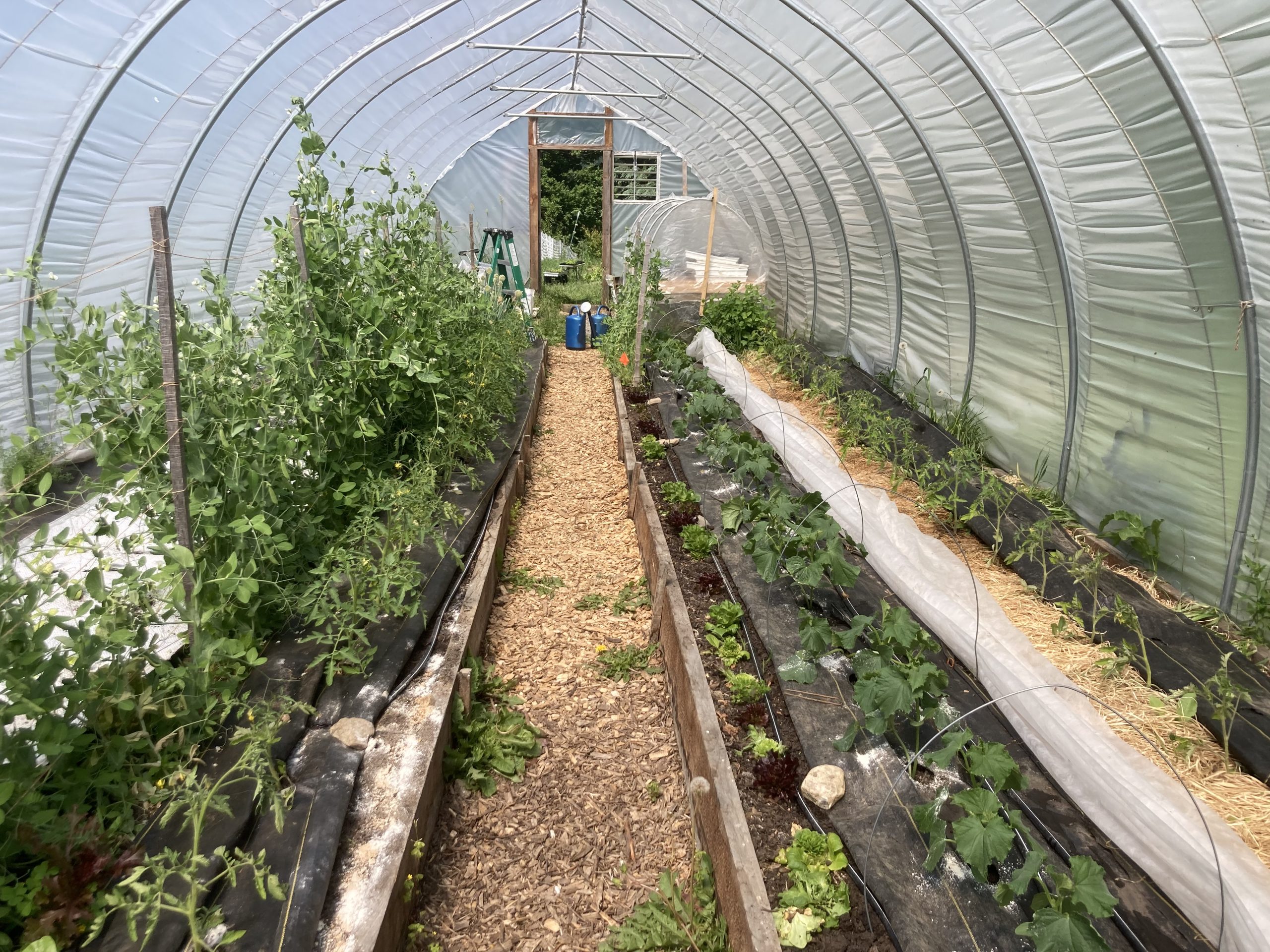 In 2021 we almost doubled our number of CSA members. We also sold salad mix and tomatoes at the Westford Country Store and organized a once a month farmers’ market on the Westford Common. The addition of a 50 foot Farmer’s Friend caterpillar tunnel was a huge benefit for increased seed starting space and tomato growing. At one point in June the tomatoes, snap peas, and lettuce were all growing together in the same greenhouse bed, making for quite a jungle. Other farm improvements included a shed for washing greens under and a walk-in cooler that was completed in the fall. Many CSA members enjoyed picking their own bouquets from the flower patch. Some people signed up for additional locally made products including sourdough bread, eggs, honey, mushrooms, and more, which got rave reviews. This season came together with many helping hands: friends helping put up the hoop house, a friend expanding/regrading our driveway with his tractor, work share members chipping in at planting and harvest pinch points, weekly help from a young farm apprentice, sign painting by another artistic young person, lots of picking help by Amanda, and of course rodent control by Mr. Myron.