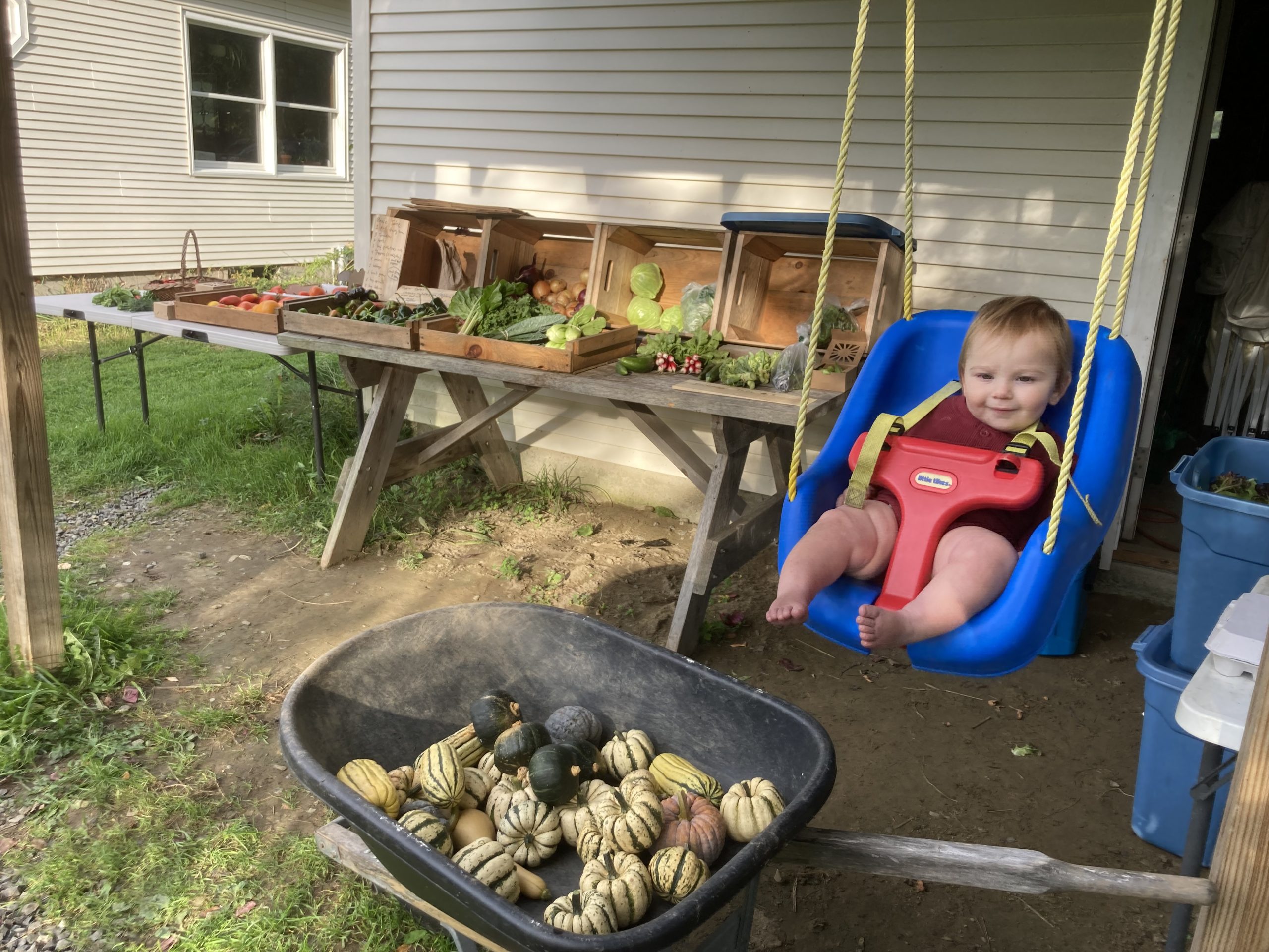 In 2022 we had 21 CSA members and we also participated in two Westford Farmers Markets. Having the walk in cooler was a huge improvement. We also converted a washing machine into a salad spinner and purchased a used BCS walk-behind tractor. These all added greatly to the efficiency of our operation. Probably the most helpful were the CSA work-share members and our high school student helper. Overall, 2022 was a good growing season, especially for our daughter Rosa who was born in September, right at the end of the CSA season.